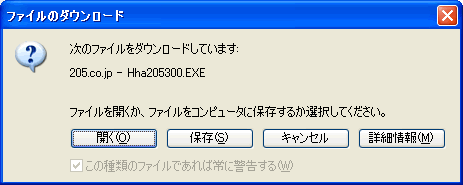 ●下のような画面が表示され、配布用ファイルのHha205311.EXEのダウンロードが開始されます。