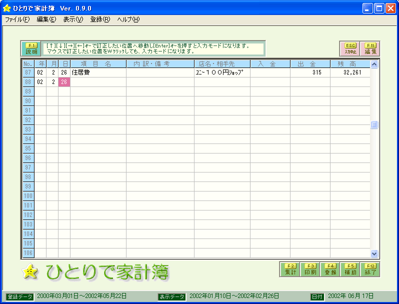 ひとりで家計簿 Ver.3.1.1 2004/01/13